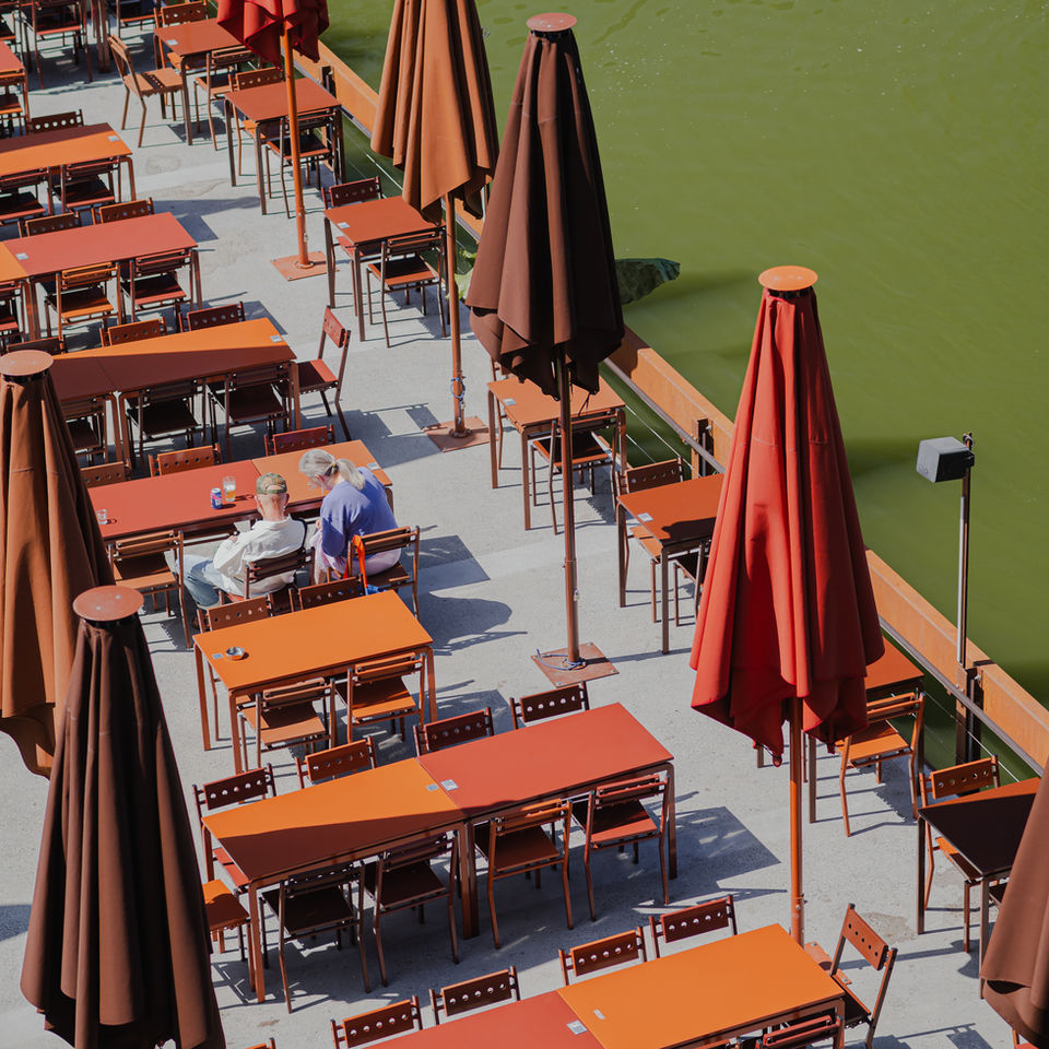 Création d'un gamme de tables et de chaises au sein des ateliers J&J à l'occasion de l'ouverture du nouveau food market Fox à Watermael-Boitsfort, dans l'ancienne Royale Belge.
